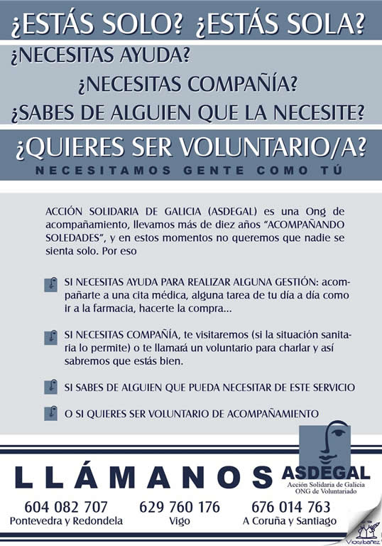 Llámanos si te sientes solo o conoces alguien que necesite compañía Vigo | Pontevedra | Santiago | A Coruña 22 Octubre, 2020 Haz clic en cada foto para ver el folleto en un tamaño mayor.