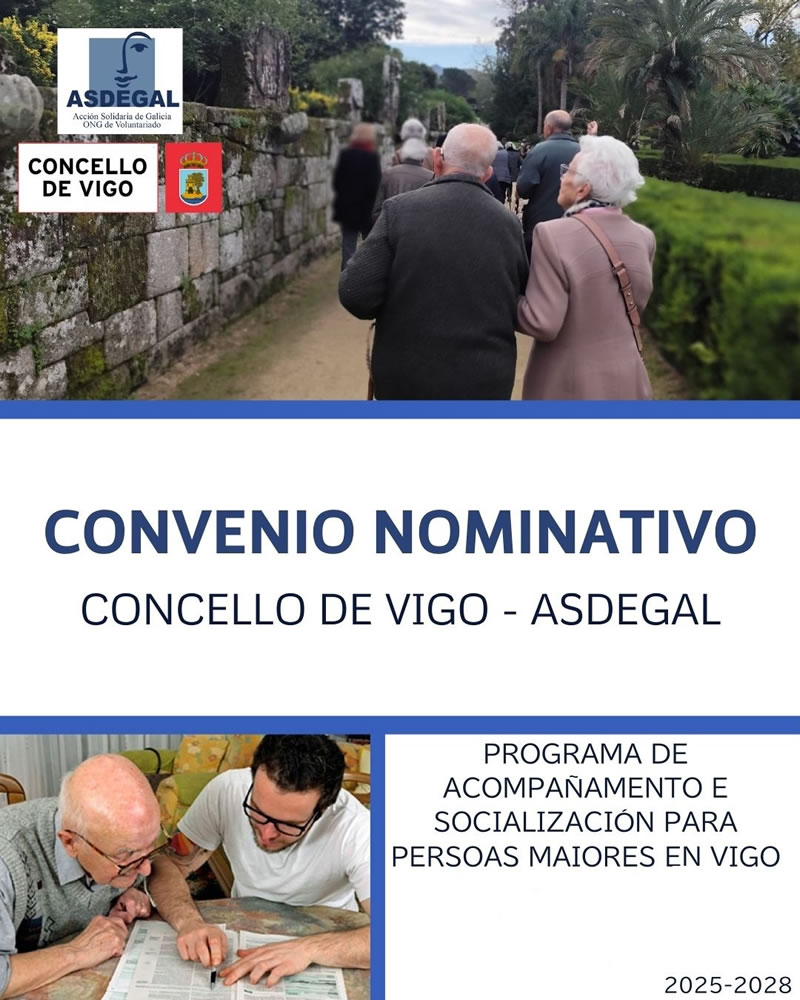 Hemos firmado un convenio de colaboración con el Concello de Vigo para el período 2025-2028. Se trata de un programa de acompañamiento y socialización para personas que viven en situación de soledad en la ciudad de Vigo.