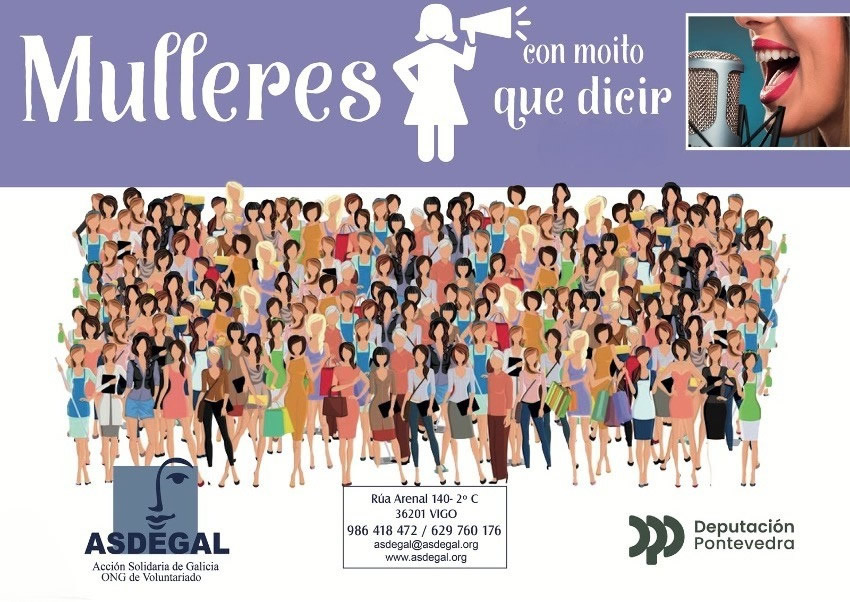 "Mulleres con moito que dicir" es una propuesta dirigida a visibilizar la problemática de mujeres gallegas en situación vulnerable. Asdegal realiza con este programa -subvencionado por la Diputación de Pontevedra-, una labor de formación, orientación y ayuda a estas mujeres.