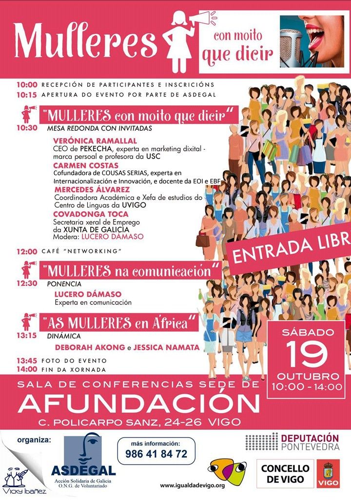 O próximo sábado, 19 de outubro teremos unha nova xornada do proxecto “Mulleres con moito que dicir”. Nesta ocasión, contarannos a súa experiencia varias mulleres do mundo empresarial e da comunicación. Tamén teremos unha dinámica africana con sorpresa incluida (traede un fular se queredes participar!)