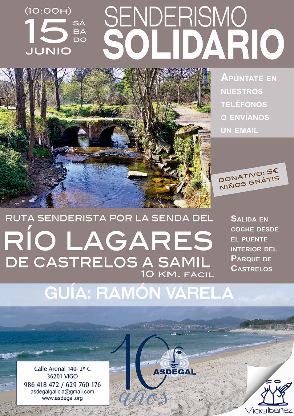 RUTA SENDERISTA, SENDA DEL RIO LAGARES 10 KM. FACIL.: la mayoría ya la conocéis y si queda alguien que no, pues que buena ocasión para hacerlo con ASDEGAL. Hacemos el tramo que va de Castrelos a Samil, totalmente llano pegados al río. Al llegar a Samil, quedamos allí un rato, tomando un café, paseando, o si esta día de playa nos podemos dar un baño. La vuelta la hacemos por el mismo camino.